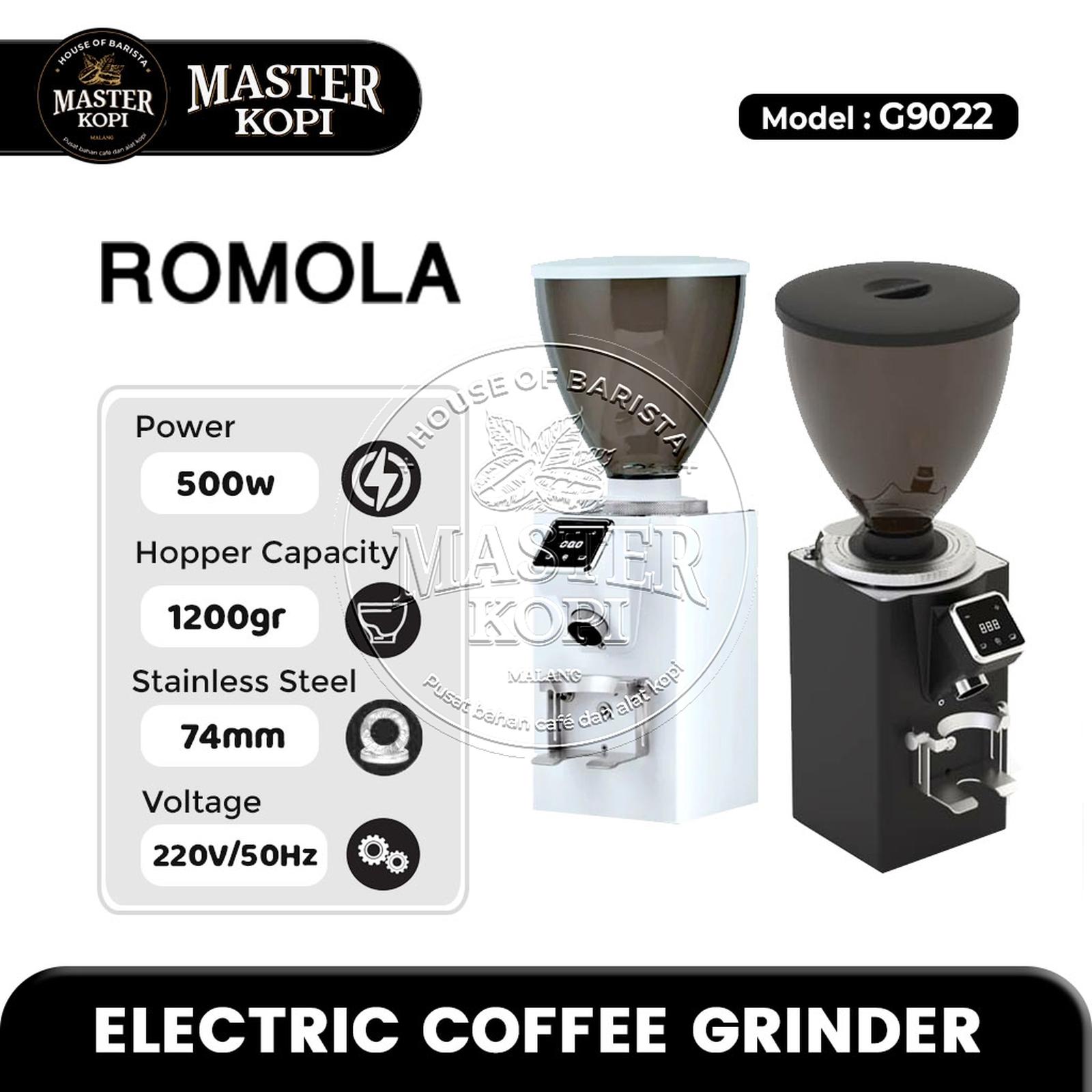 Dengan motor bertenaga 500W dan sistem pengaturan grind size fleksibel, ROMOLA G9022 menjadi pilihan ideal sebagai grinder kopi espresso komersial maupun grinder kopi elektrik rumahan kelas profesional.